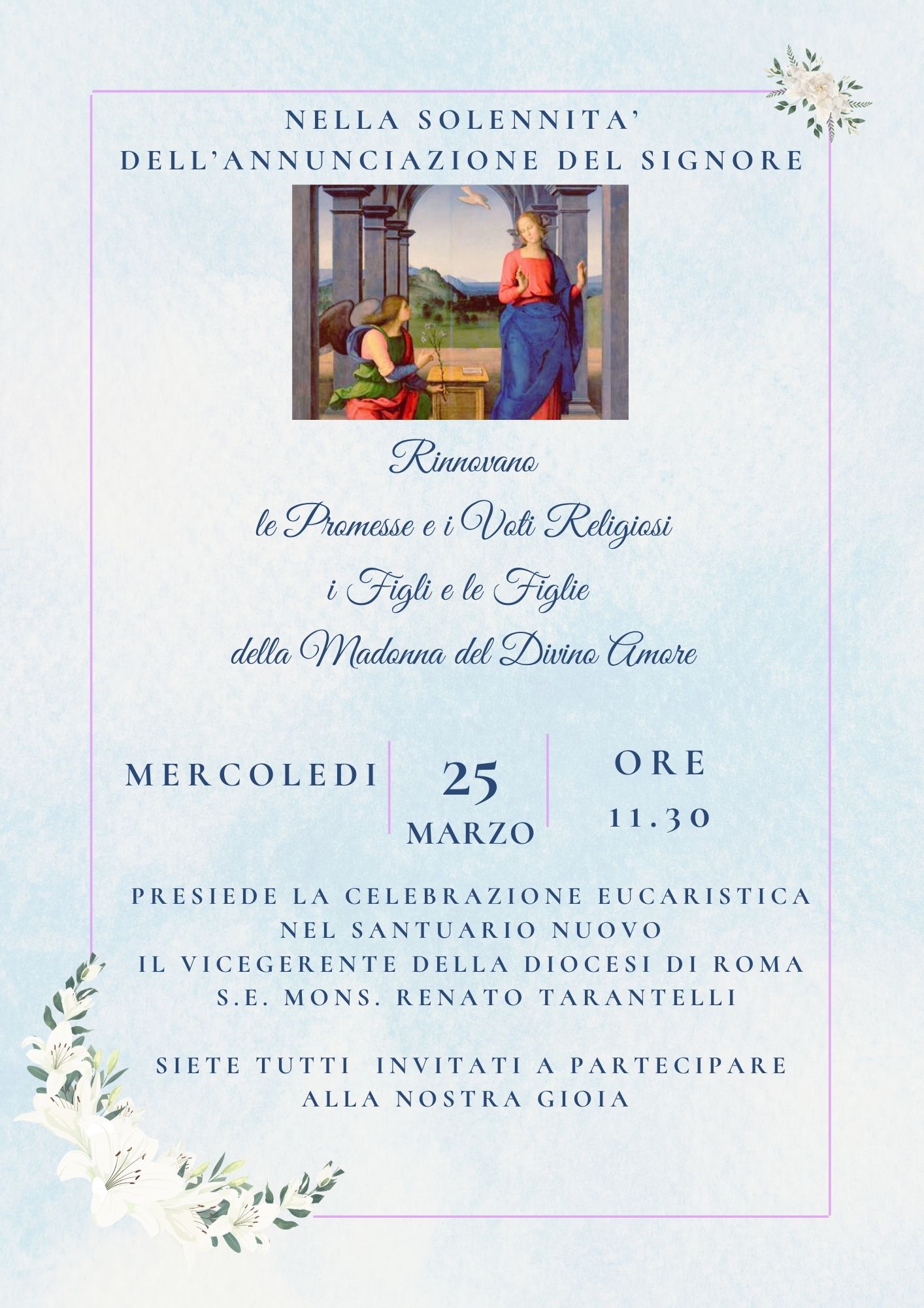 Il nostro Carisma, affidatoci dal Servo di Dio Don Umberto Terenzi: "Conoscere e far conoscere, amare e far amare la Santa Madre di Dio, costi quel che costi", lo esprimiamo e attuiamo attraverso la pastorale giovanile, missionaria, parrocchiale sanitaria, di accoglienza e educativo-didattica.